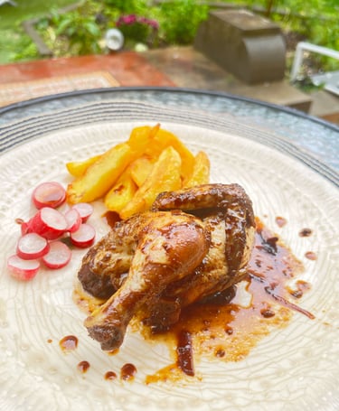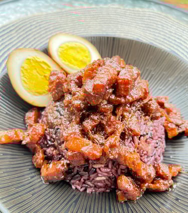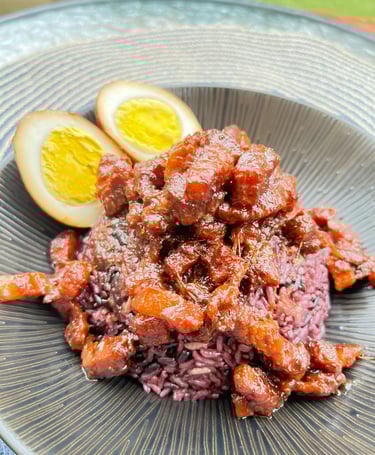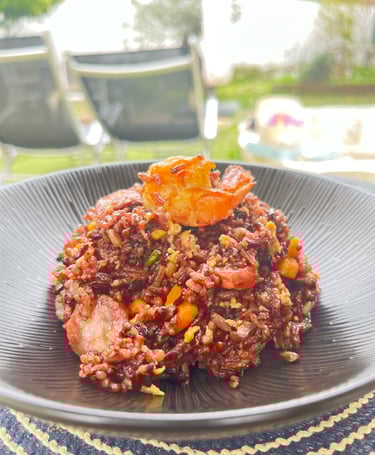 Mon riz a cette couleur noire car il résulte d'un mélange de 4 types de riz : riz blanc, riz noir, riz brun (riz dont on a enlevé la cosse, mais dont on garde le son et le germe) et petit mil (sétaire d'Italie). Ce mélange de riz, très parfumé et riche en saveur est meilleur pour la santé. Toutefois, si vous le désirez, je peux réaliser ce plat à base de riz blanc uniquement. Si tel est le cas merci de le préciser dans votre SMS.
