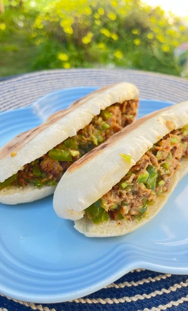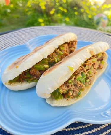 Le rou jia mo ( 肉夹馍 litt. « viande insérée dans du pain ») , est une sorte de petit sandwich, constitué d'un pain long ou rond que je réalise moi même , au milieu duquel on place de la viande, généralement mélangée à du poivron ou piment vert, typique de la cuisine du Shaanxi Merci de préciser dans votre SMS si vous préférez de la viande de porc ou de poulet et si vous préférez épicé ou au poivrons et aux oignons.